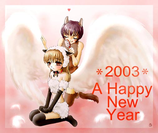 2003年の年賀絵です。 セクシー羊コスプレのさおりの羽根をブラッシングする美里。 いうまでもなく、美里は狼です(笑)。 羽根ブラッシングのシーンは小説でも書きたかったのですが、そうするとキタハラ作品中もっとも健全なはずの『月羽根』が、もっともえっちぃ作品になってしまいそうだったので却下しました。 さおりにとって、羽根は性感帯なんです(笑)。