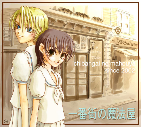 『一番街の魔法屋』の3代目(現役)表紙絵です。 向上心あふれるうずらさんは、自分の昔の絵が気に入らなくなると、新しい絵を送ってくれたりします。 ということで、さらにグレードアップした『一番街』表紙絵。 ところでこの絵、奈子や美杜の水着姿と比べると、フィーニのナイ乳ぶりがよくわかりますね〜(笑)